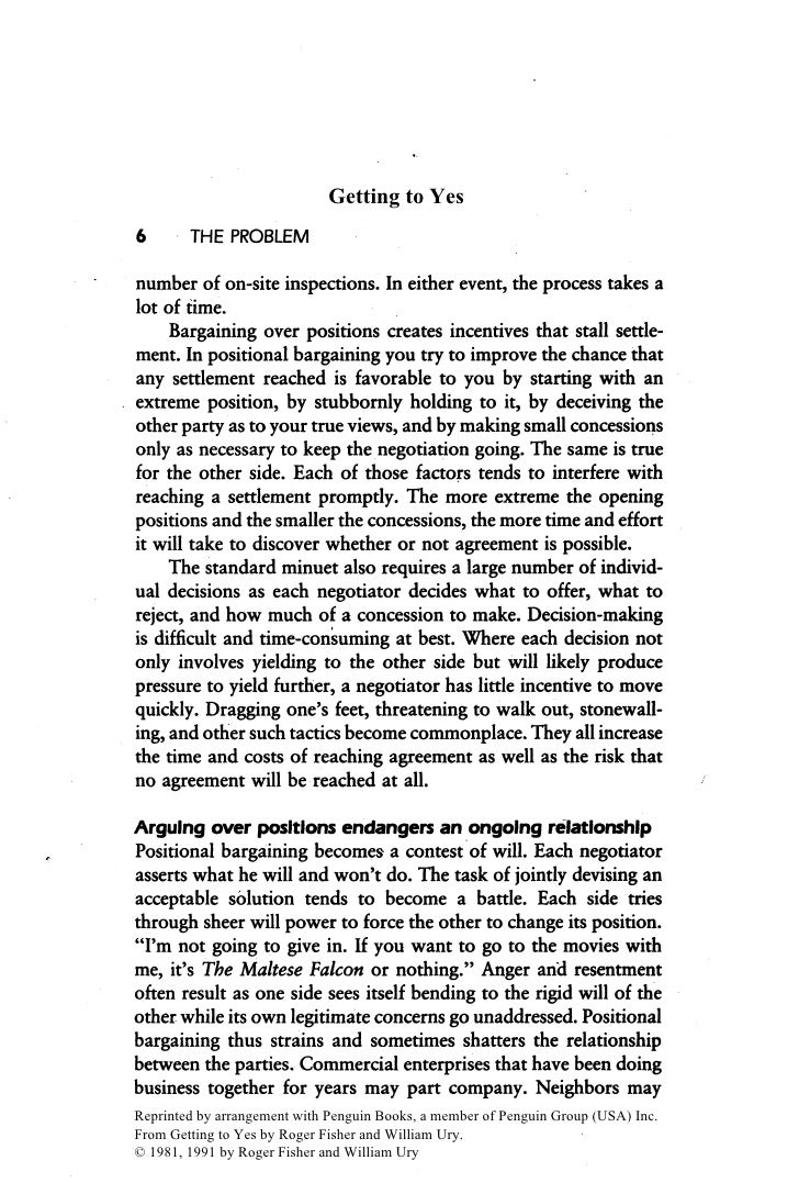 This is written in APA format. Fisher Agreement Without Yes In, to educate readers on how to become better, more effective negotiators. They start with describing their four principles for effective negotiation. It angers us and gives a sense of metal and urgency for both sides. He notes the fundamental truth that although humans will regularly shield themselves with the omnipresent first amendment, seldom do we enjoy having the privilege we so readily abuse be used metal us.